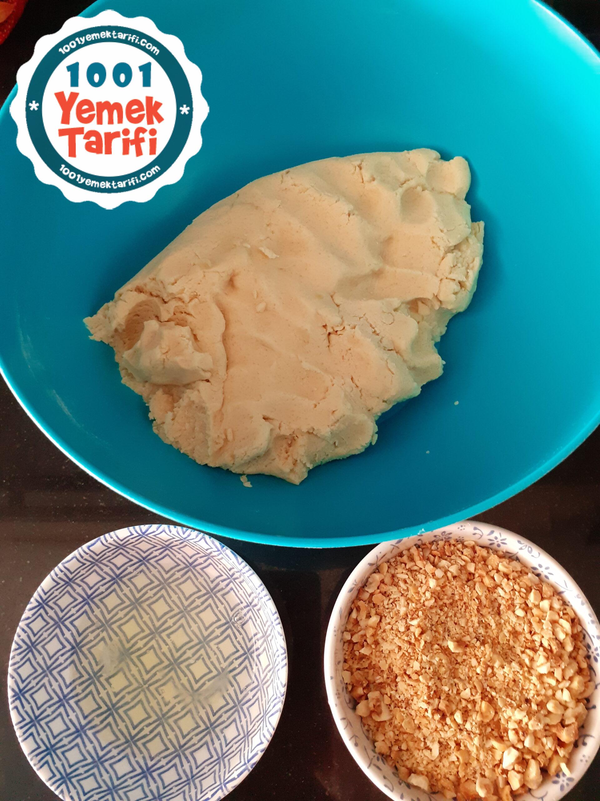 - Hamurumuzdan ceviz büyüklüğünde parçalar koparıp elimizde yuvarlayalım ve ilk önce yumurta beyazına ardından fındığa bulayıp fırın tepsisine dizelim.