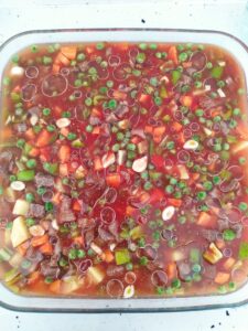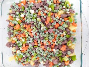 • Onun üzerine sırasıyla et, biber, bezelye, sarımsak ve havucu ekleyelim.