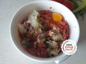 - Kıymayı derin bir kabın içerisine alın, üzerine soğanı rendeleyin.