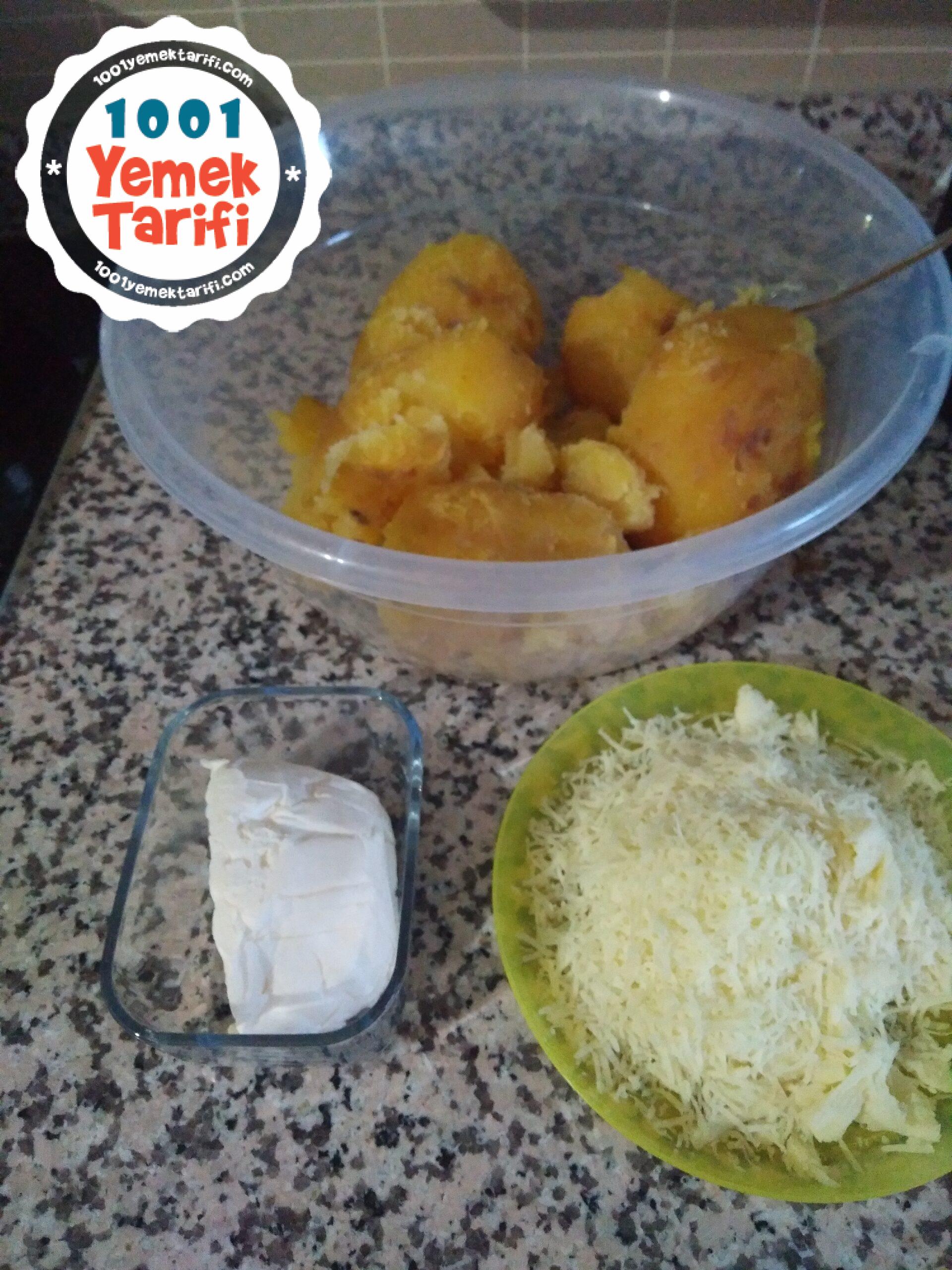 - Ben kumpirleri soyduktan sonra hepsini büyük bir kapta birleştirip , tereyağ ve kaşarı bu kapta birleştirdim.