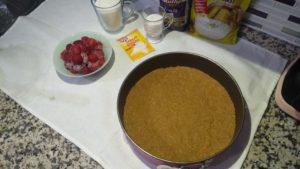 - Ayrı bir tavada margarini kaynatmadan eritelim ve bisküvilerin üzerine dökelim iyice karıştıralım.. Ve 22 cm’lik tabanına yağlı kağıt serilmiş kelepçeli kalıba dökelim.