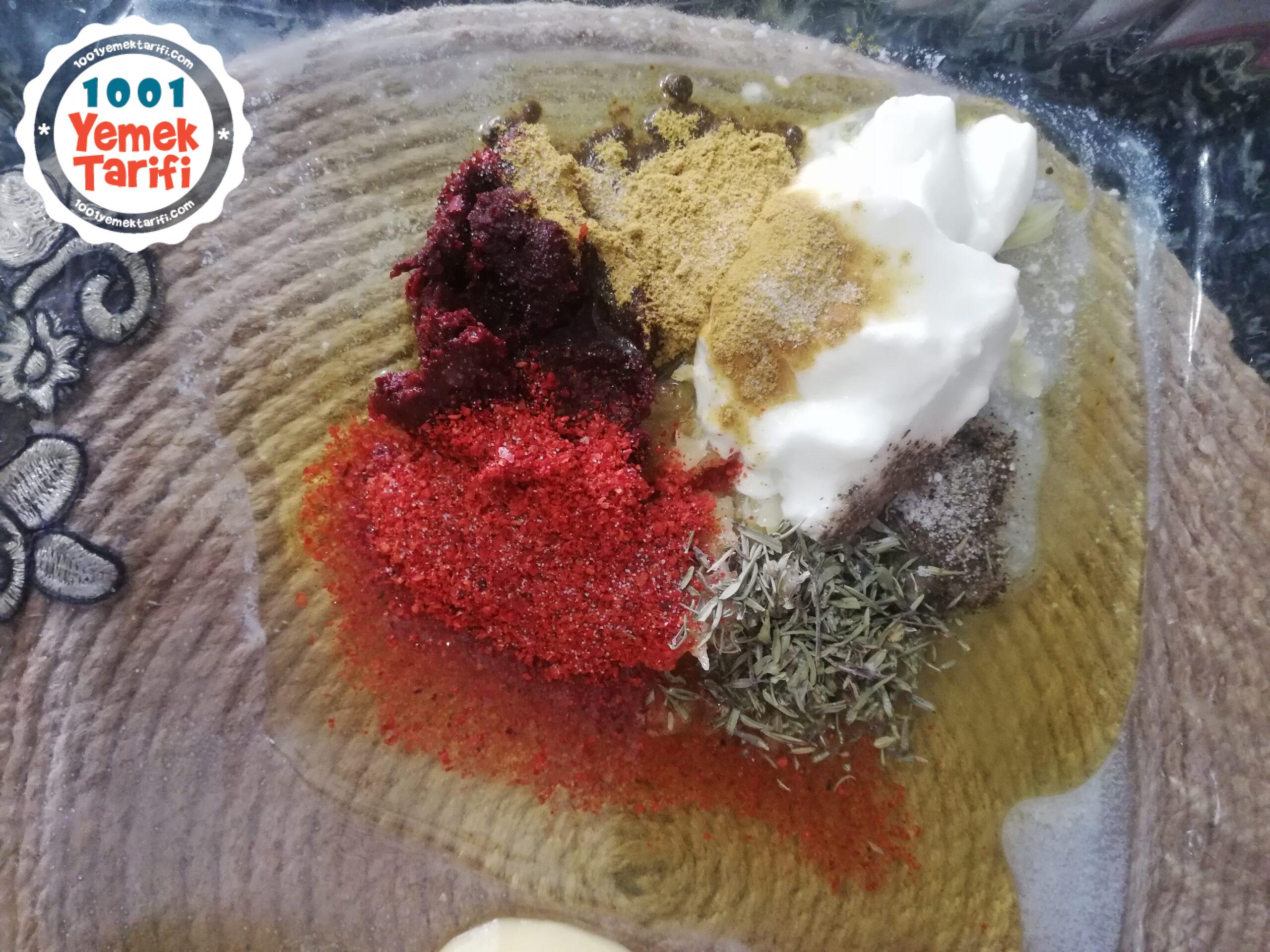 - Kabın bir kenarına Salça, yogurt, Sıvıyag ve ezdihimiz sarımsakları alalım.