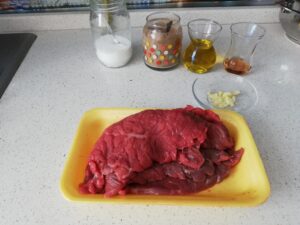 - Öncelikle biftekleri marine edelim. Bir karıştırma kabına zeytinyağını, sirkeyi, tuz, karabiber, küçük doğranmış sarımsağı alalım ve karıştıralım.