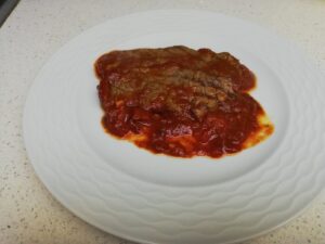 - Sosu için; domates rendesini, salçayı, zeytinyağını, küçük doğranmış sarımsağı, tuz, karabiber, pul biber ve kekiği bir tencereye alıp karıştıralım. 2 su bardağı su ekleyip tekrar karıştırıp ocakta kaynaya dek pişirelim ve ocaktan alalım.