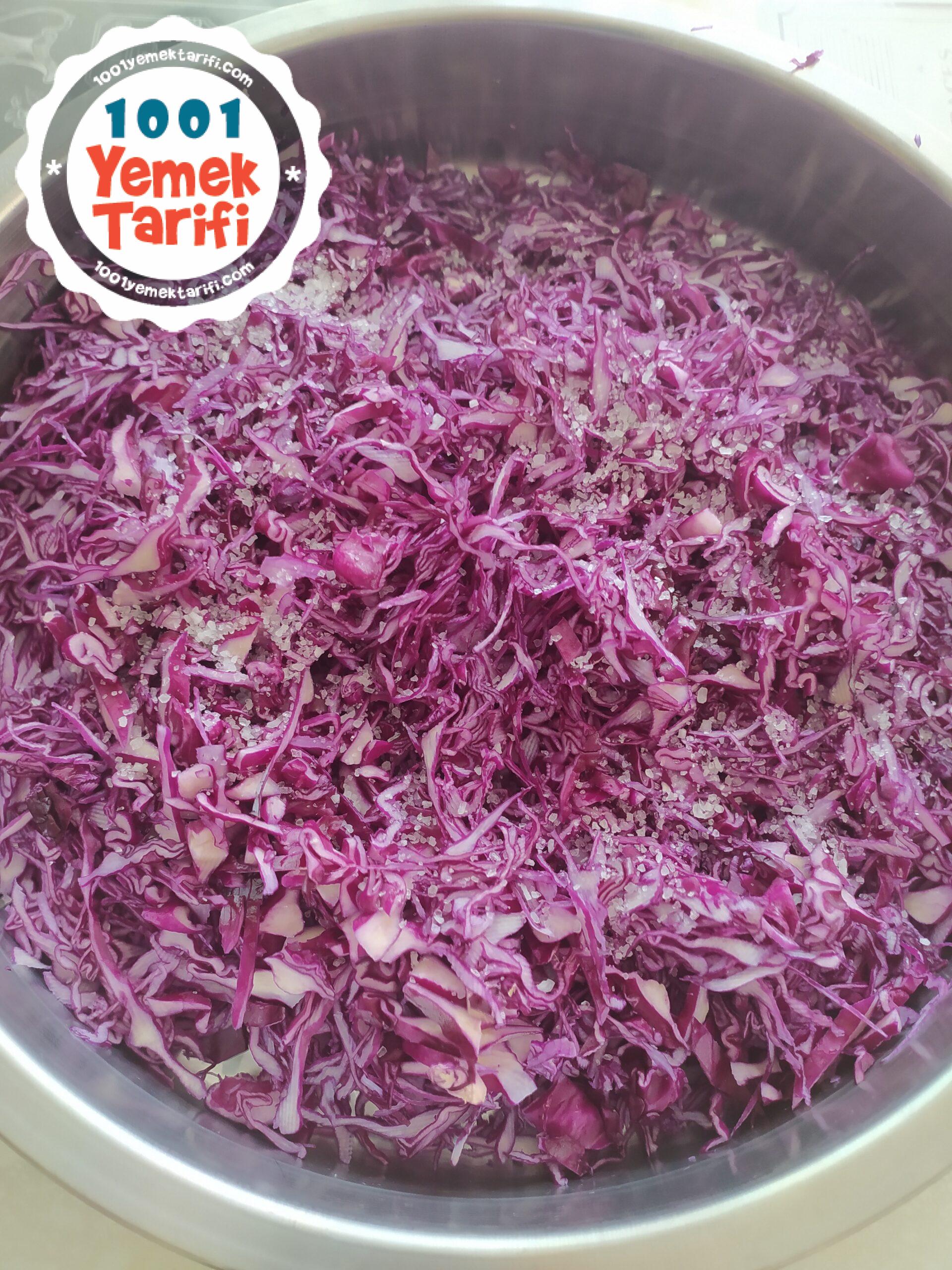 • Üzerine bir yemek kaşığı kaya tuzu eklenerek mor lahanalar elimizle güzelce ezilir.