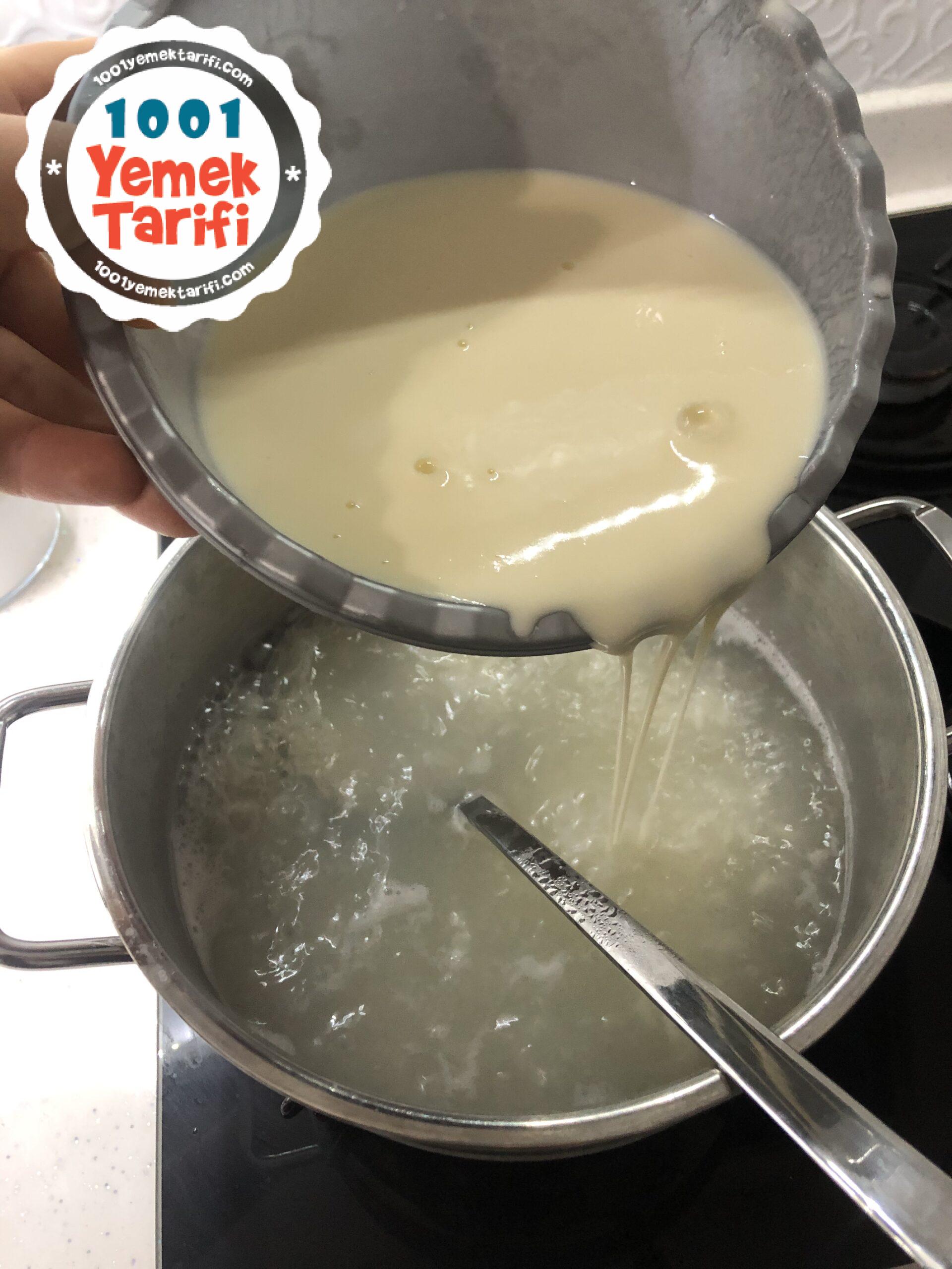 - Pirincin suyundan yoğurtlu karışıma ekleyelim