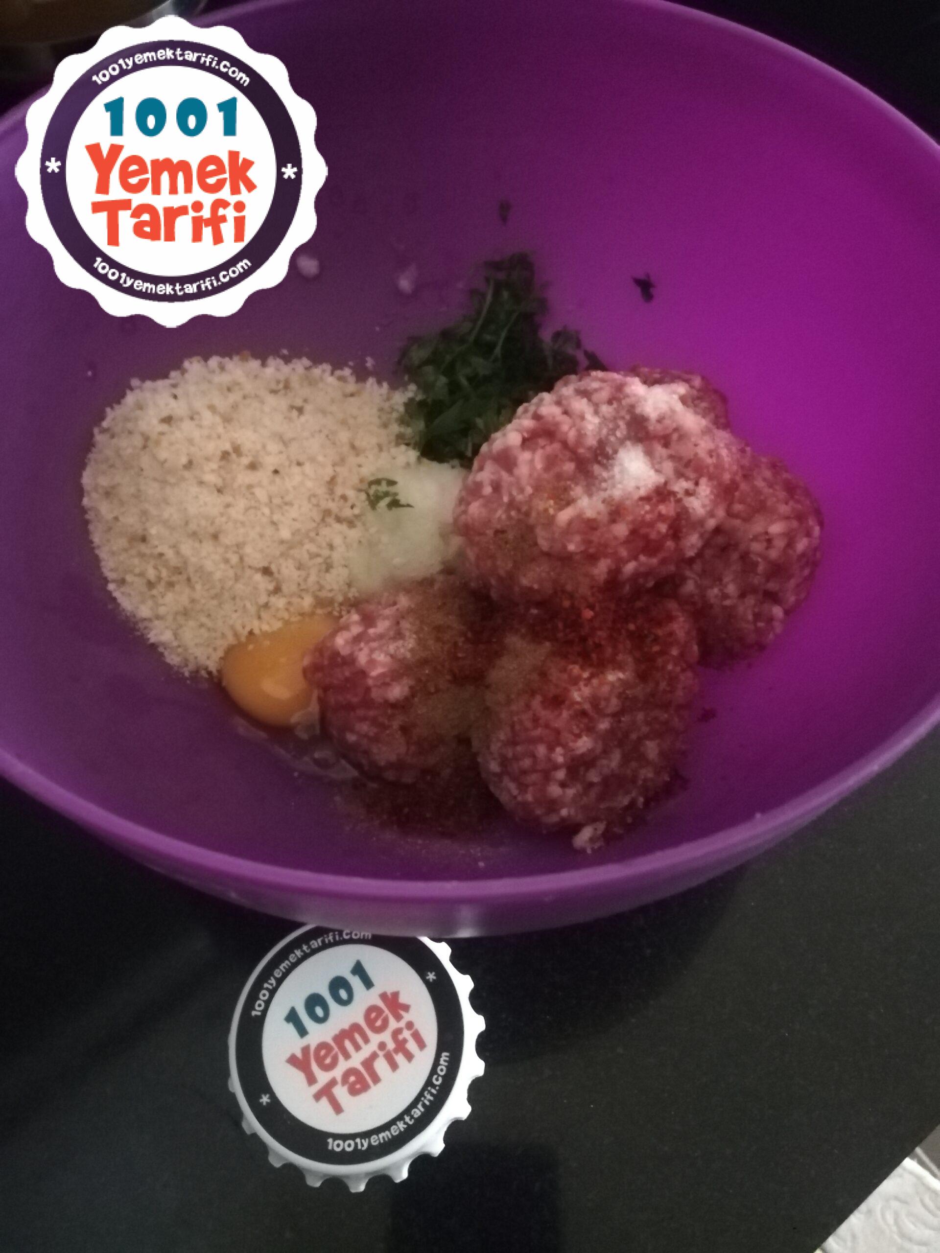 • Yoğurma kabımıza kıyma, rendelenmiş kuru soğan, ekmek içi ve yumurtayı alıp tuz, maydanoz ve istediğiniz baharatları ekleyip güzelce yoğuralım.