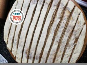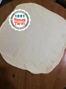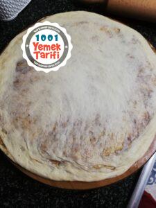 - Tüm hamur elimizin altında dururken ilk genişlettiğimiz bezeden başlayarak unlanmış tezgahta merdane ile en büyük servis tabağından daha büyükçe açalım.