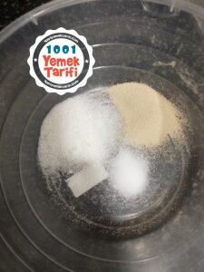 - Yoğurma kabına ılık süt, şeker ve maya alınıp 3 dakika bekletilir.