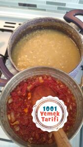 • Suyunu çekip piştiğinde gerekli olursa su ekleyelim ve üzerine ince doğranmış soğan ve salçayı zeytinyağı ile kavuralım..