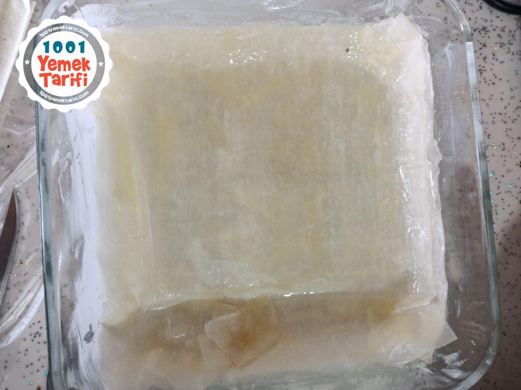 - Tepsiye üç kat yufkayı serelim üzerine erittigimiz yağdan sürelim.Her üç kata bir bu yağı aralarına sürelim.