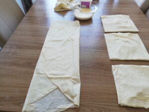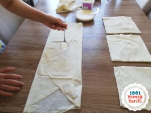 - Yufkanın bir tarafını üzerine kapatıp diğer ucuna da biraz sütlü karışım sürüp üzerine kapatalım.