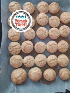 - Hamurdan ceviz büyüklüğünde parçalar kopartılıp elde yuvarlanır ve önce yumurta akına ardından hindistan cevizine batırılarak tepsiye dizilir.