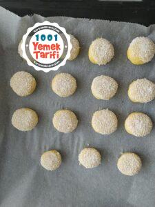 - Hamurdan ceviz büyüklüğünde parçalar kopartılıp elde yuvarlanır ve önce yumurta akına ardından hindistan cevizine batırılarak tepsiye dizilir.