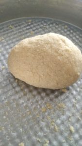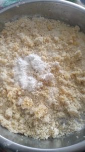 • Kabardıktan sonra ayrı bir tepsiye dökelim ve üzerine unumuzu ilave edip yoğuruyoruz.
