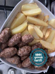 - Patateslerimizi yıkayıp irice kızartacak şekilde dilimleyelim ve önce patatesleri daha sonra köftelerimizi yağ koyduğumuz tavamızda kızartalım.