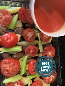 - Son olarak domates ve biberlerimizi dilimleyip köftelerimizin üzerine dizerek sosumuzuda ilave edip önceden ısıttığımız 200 derecelik fırınımızda pişirelim.