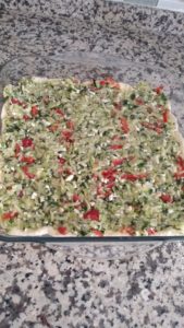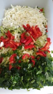 - Kabakları rendeleyip suyunu sıkalım. Peynir, maydanoz, sıvı yağ ve diğer iç harcı malzemelerini de ilave edip ayrı bir kapta karıştıralım. Her yerine eşit şekilde dökelim..