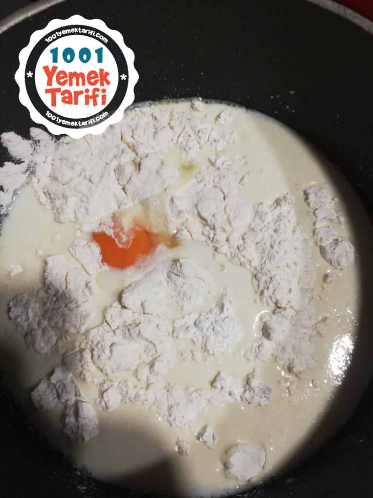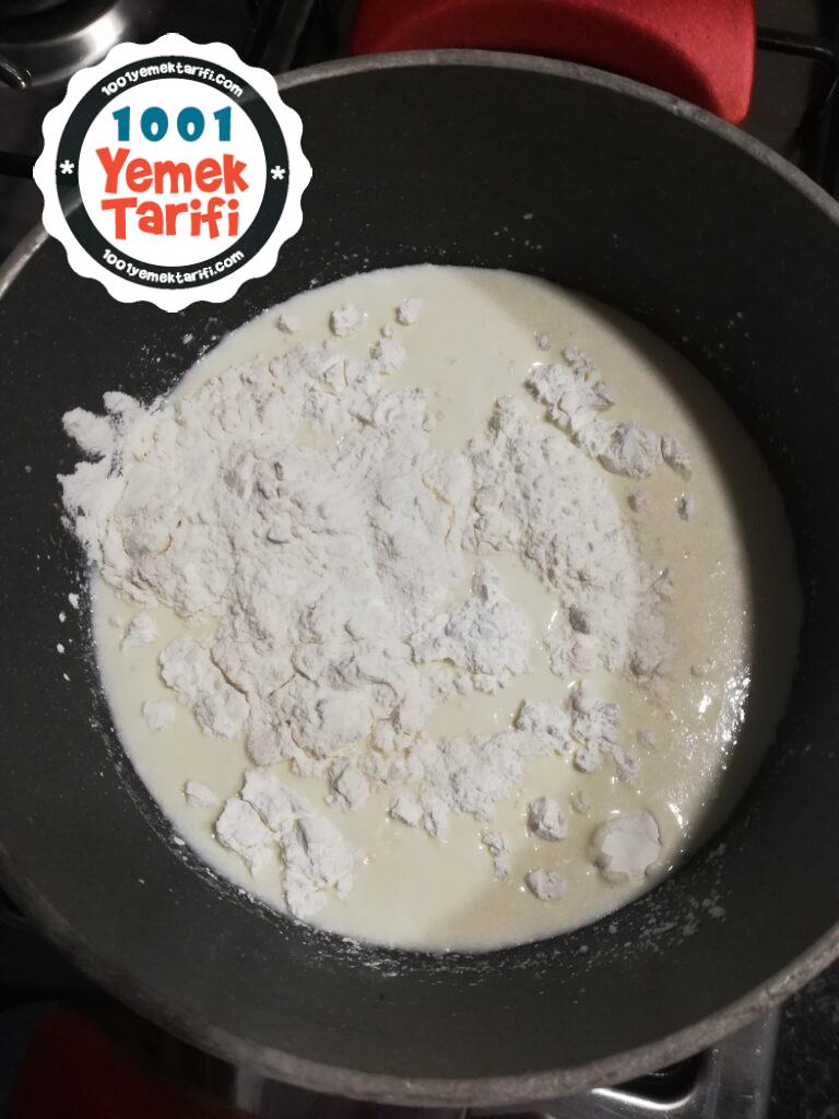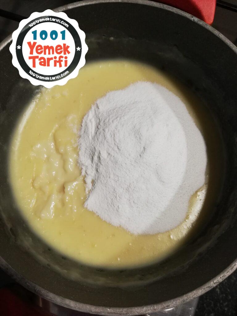 - Sütün içine unu, vanilyayı ve Mısır Nişastasını koyalım.