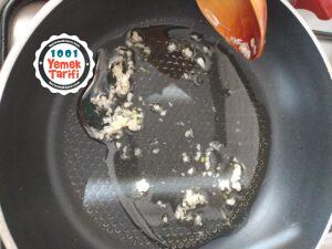 - Sarımsaklar ezilir ve zeytinyağı ile tavaya alınarak kavurulur.