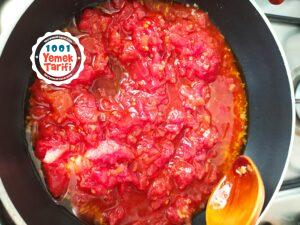 - Üzerine yarım tatlı kaşığı biber salçası eklenir ve domatesler suyunu çekene kadar pişirilir.