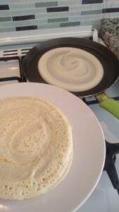 • Azıcık yağladığınız (her krepe 1 çay kaşığı yağ) krep tavasına krep harcını dökelim ve kepçenin ters tarafıyla düzleyip şekil verelim…