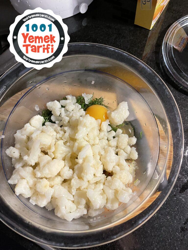 - Ilıyan karnabaharları yoğurma kabına alın ve üzerine soğanı rendeleyin.