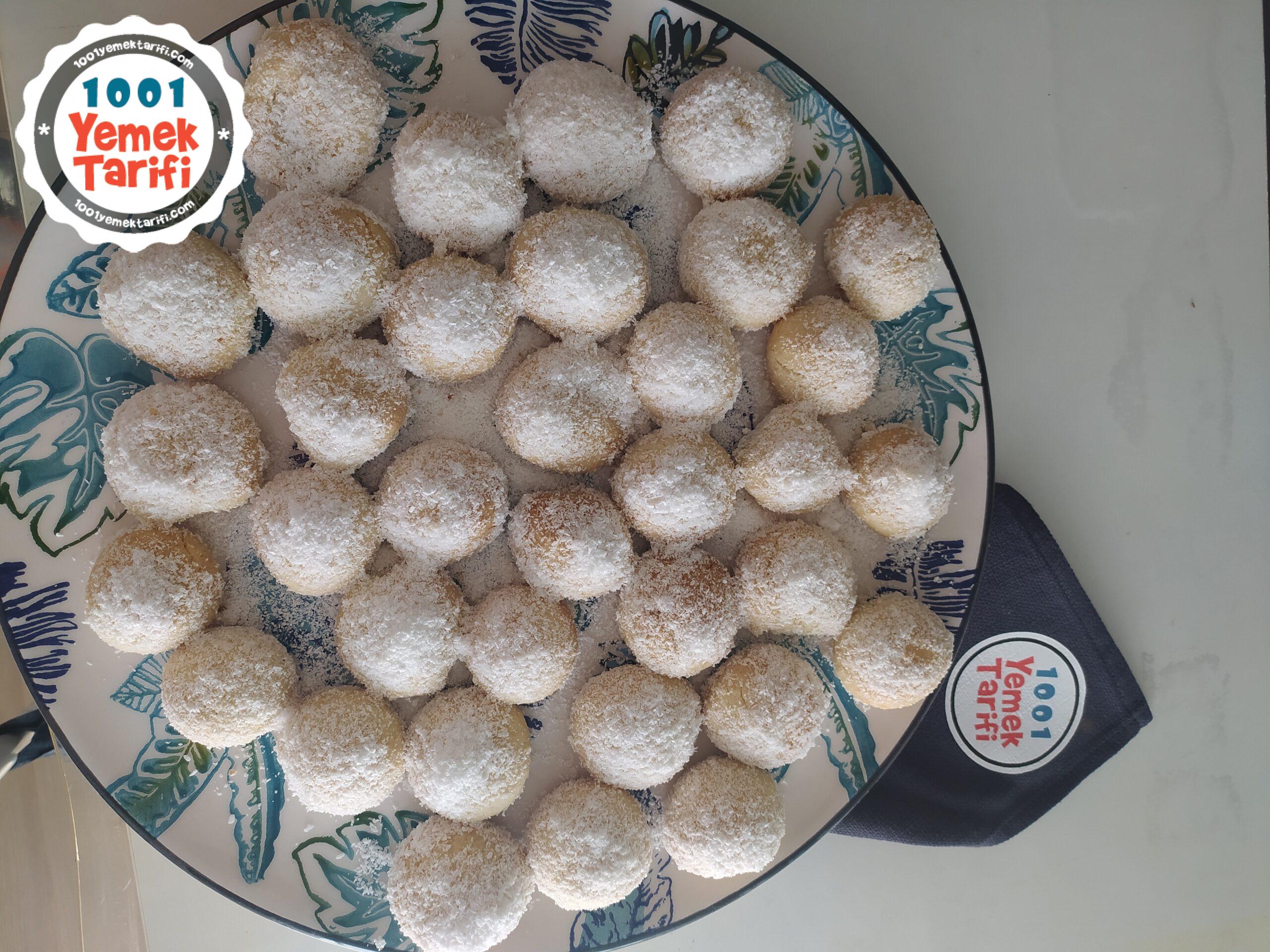 • Kurabiyeler pişince sıcak iken hindistan cevizli karışıma bulanır ve servis tabapına alınır.