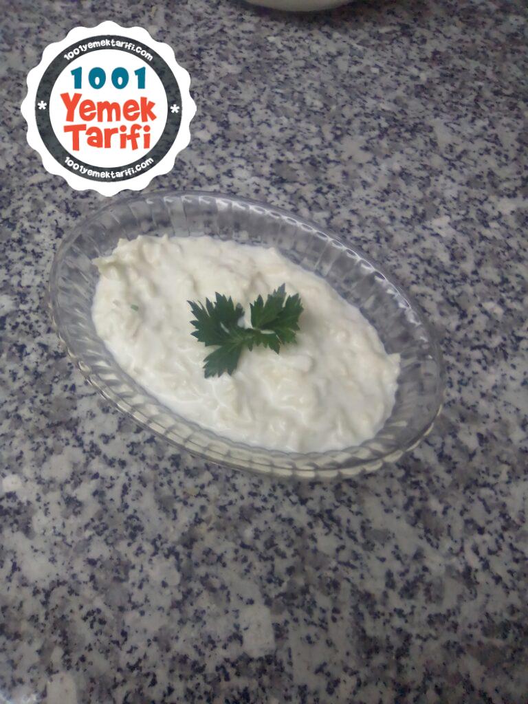 • * 1,5 Su bardağı süzme yoğurdun içerisine tuz ve sarımsağı ekleyip soğumuş olan kerevizimiz ile karıştırıyoruz.