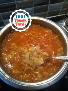 • Kesme hamurları ekleyip bir iki çevirelim ve üstüne sıcak su ekleyelim