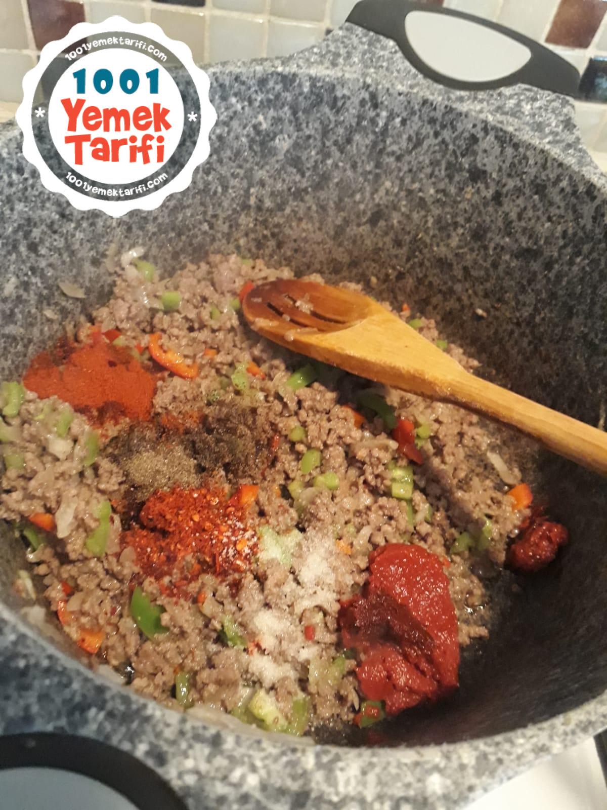 - Baharatları ve salçaları ekleyip karıştırın.