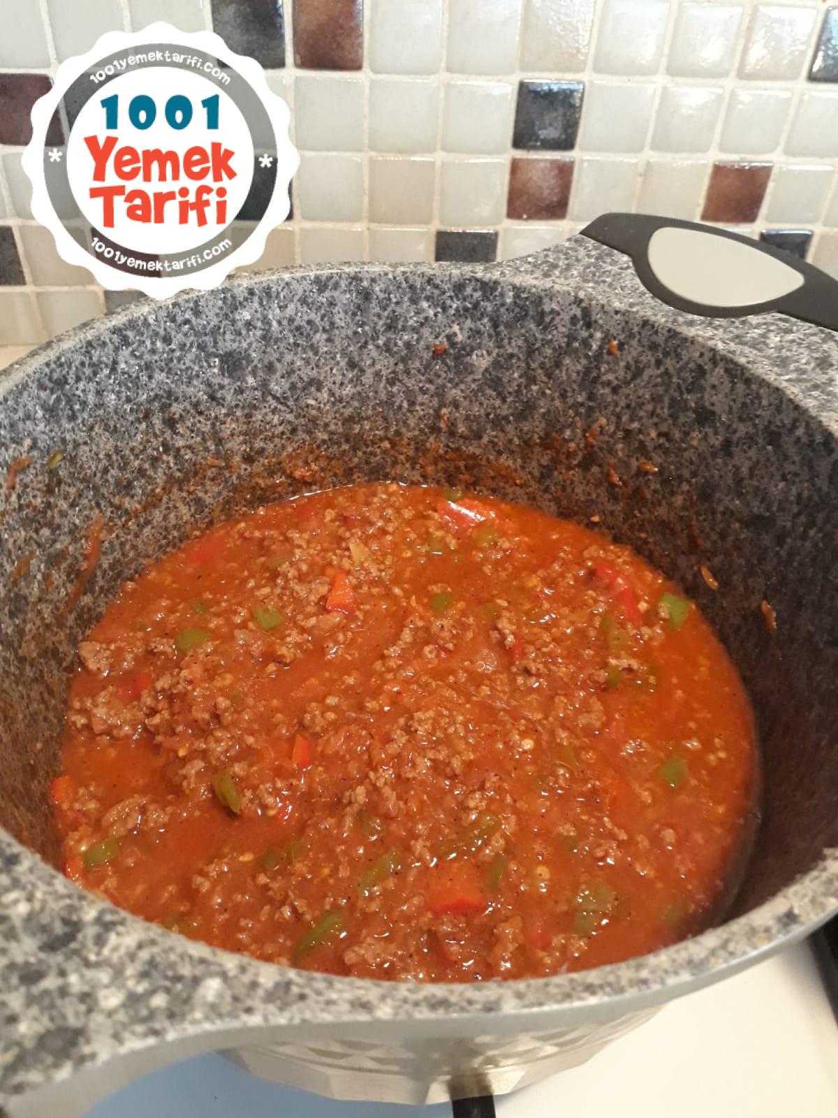 - Üzerine pişen kıymalı sosu yaydırın.