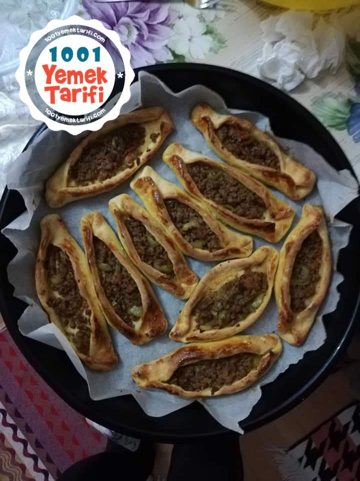 - Üzerine kıymalı harç koyup iki kenarlarından kapatıp pide şekli verin, ortası açık kalsın resimdeki gibi.