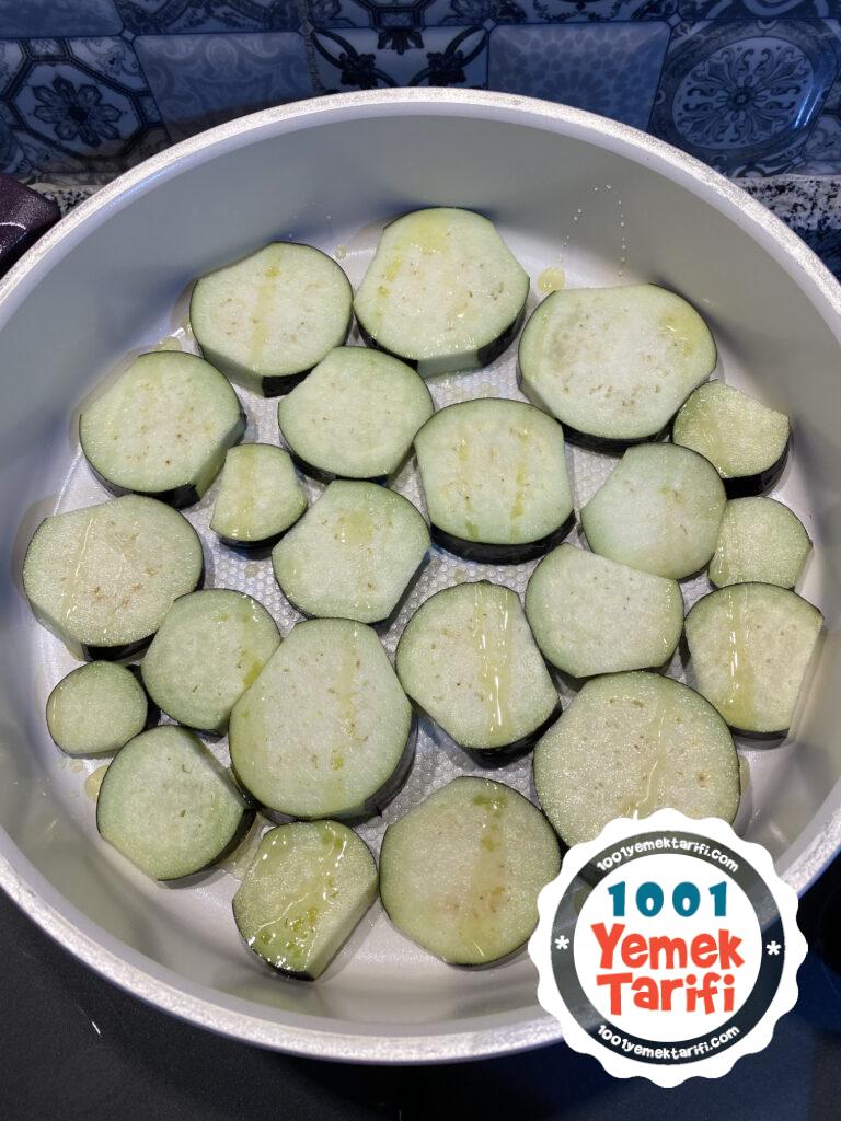 • Patlıcanları hafif zeytinyağı sürdüğümüz tavaya dizip üzerine biraz daha zeytinyağı serpelim ve kapağı kapalı şekilde yüksek ateşte 2-3 dakika pişirp sonra patlıcanları çevirelim,diğer yönü de yine 2-3 dakika pişirelim.(patlıcanlar yumuşayacak ve hafif kızaracak)