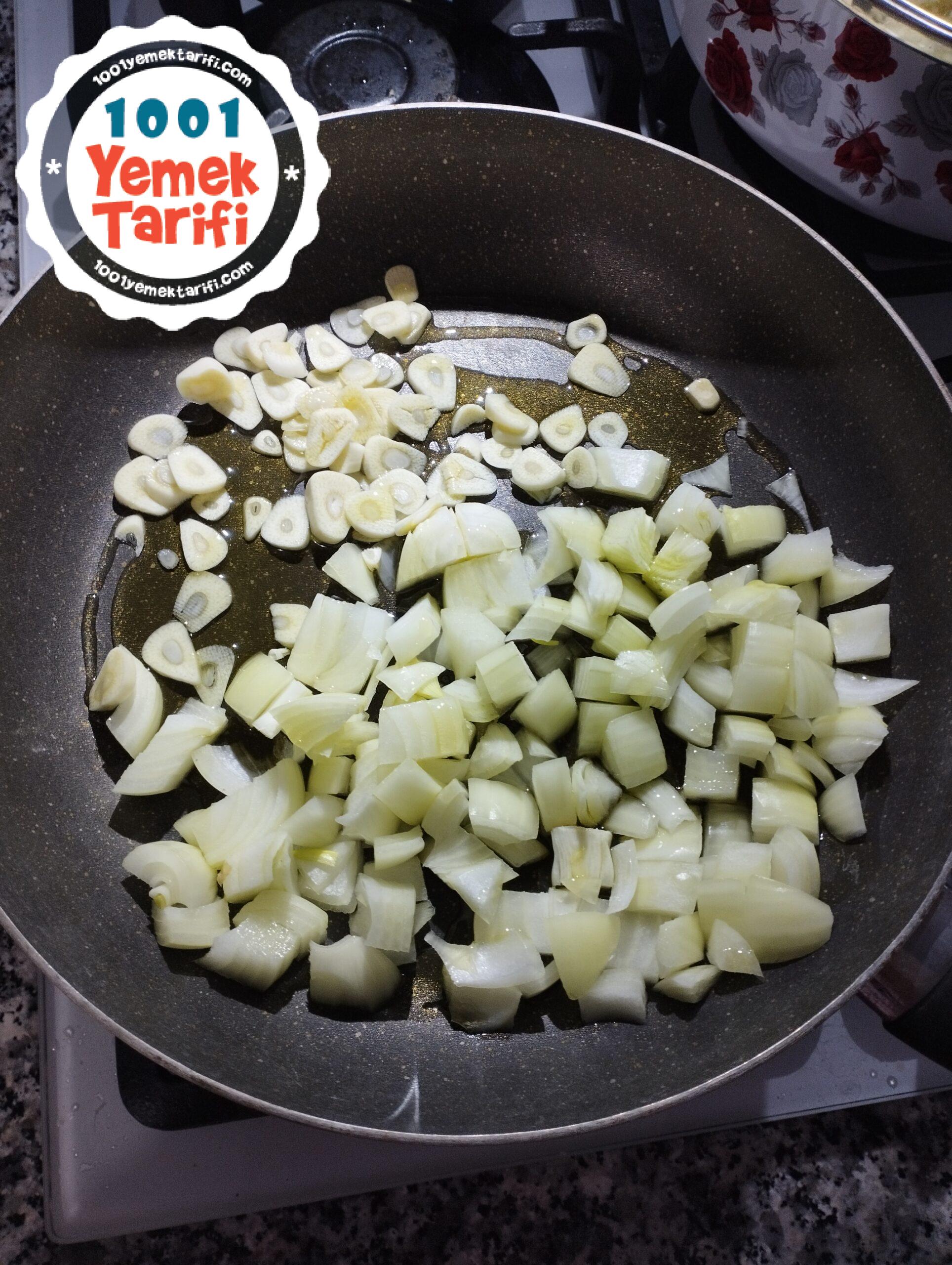 - Tavamıza sıvıyağımızı alıyoruz, yemeklik doğradığımız soğan ve sarımsağımızı ilave ediyoruz ve ocağımıza alıyoruz.