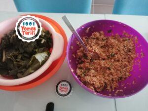- Yaprakların damarlı kısımları bize bakacak şekilde tezgaha serip içini koyup saralım.