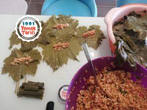 - Yaprakların damarlı kısımları bize bakacak şekilde tezgaha serip içini koyup saralım.