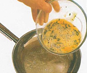 - Omletin iki tarafı da pişince tavanın sapını yukarıya doğru kaldırıp, sağ eliniz ile tavanın sapından ileriye doğru omleti çatalla kıvırarak rulo haline getirin. Sonra servis tabağına çıkarın.