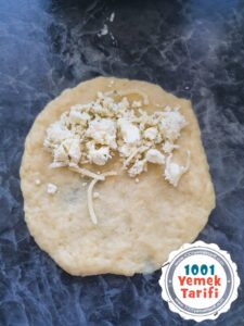- Bezeleri bekletmeden tezgahta oklava ile açın. İçerisine peynir koyup kapatın tepsiye dizin.