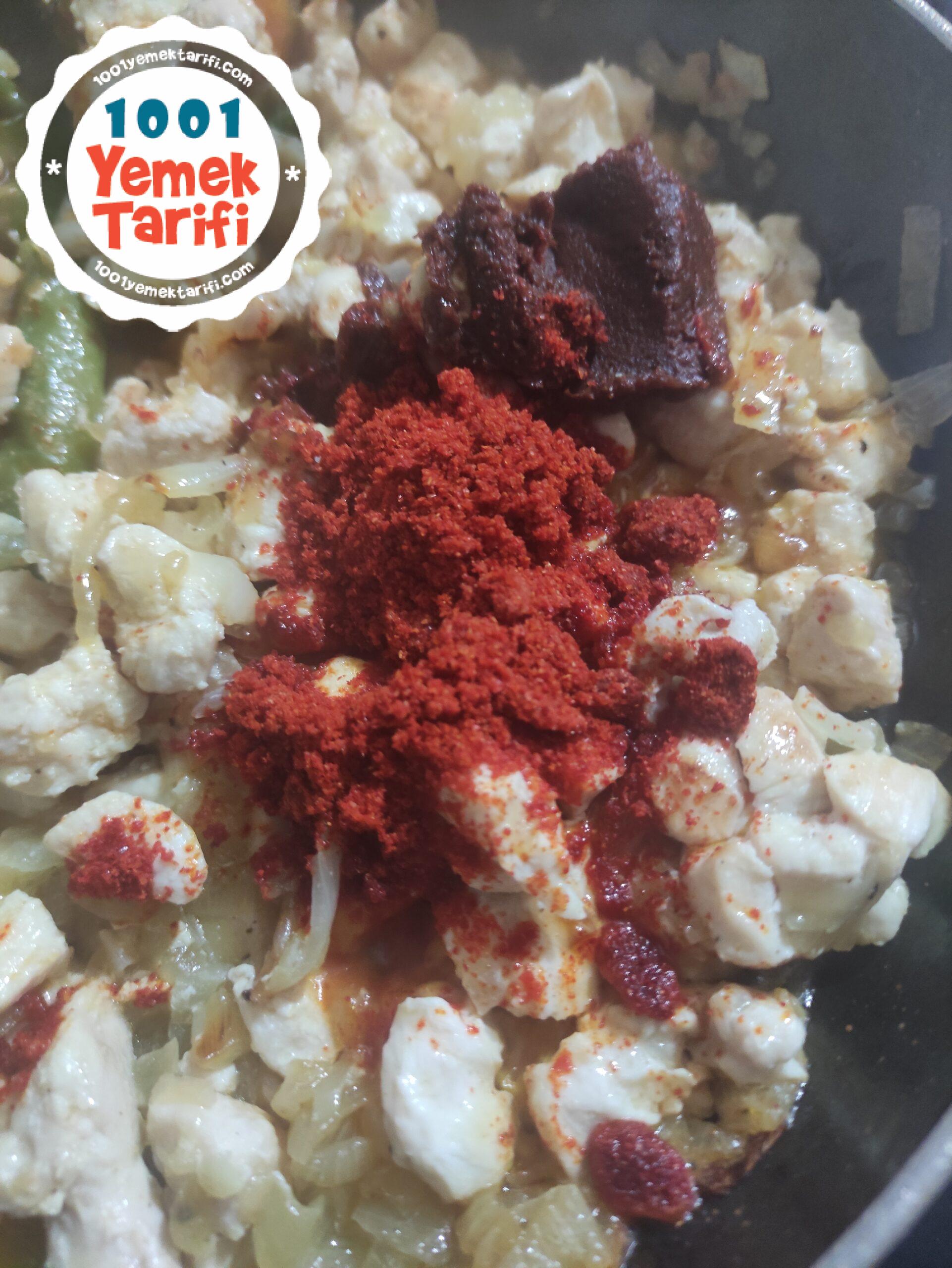 • Tavuk kavrulunca salça, toz biber eklenerek iyice karıştırılır.