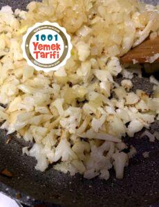 - Aynı tavaya 2 çorba kaşığı zeytinyağı ekleyip karnabaharları ilave edin. Karnabaharlar kahverengileşmeye başladığında uzunlamasına kesilmiş 5 diş sarımsağı tavaya ekleyip beş dakika kadar kavurun.