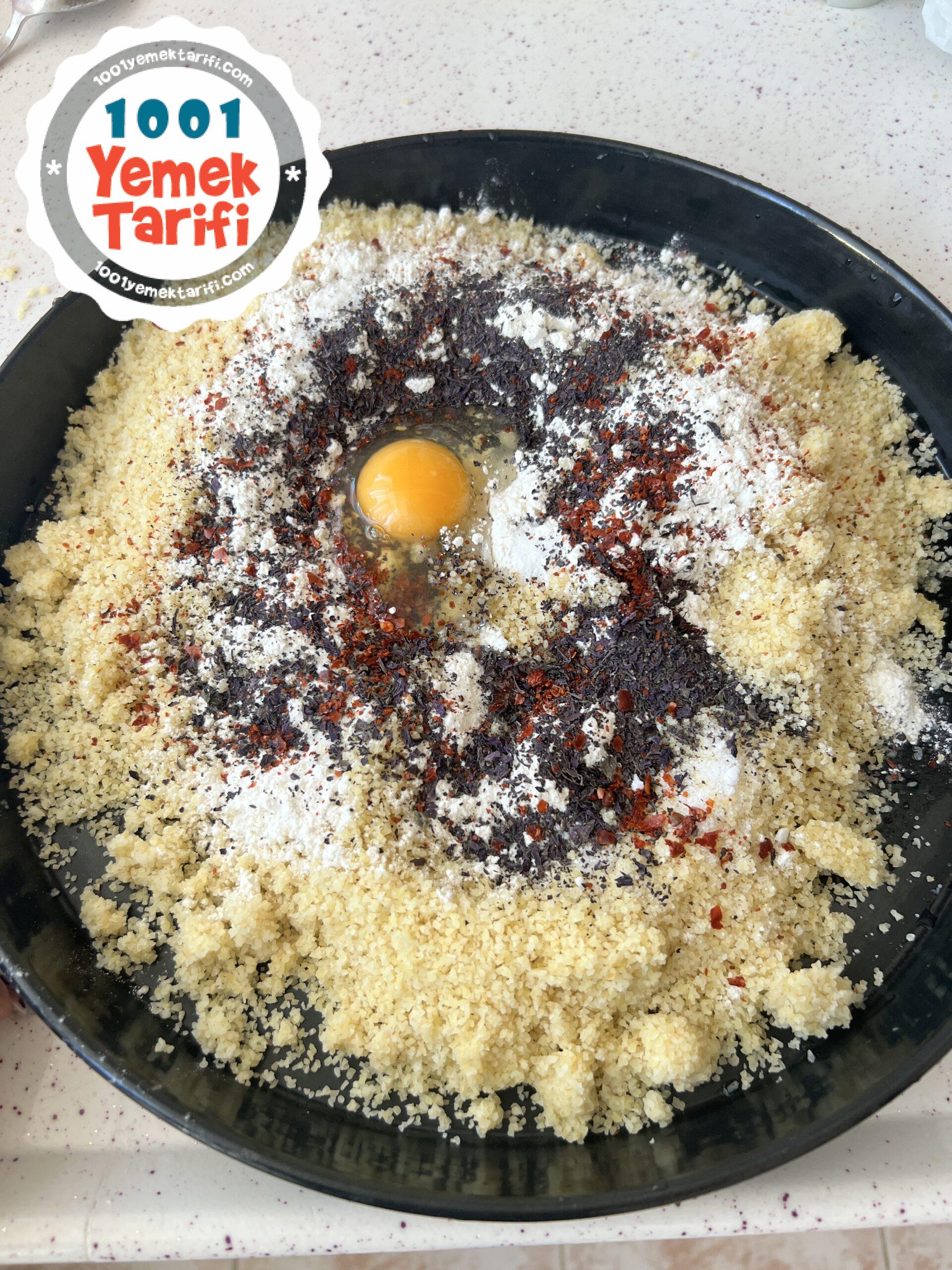- Üzerine yumurta un reyhan pul biber ve tuz ekleyip ovmaya başlayalım