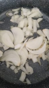 • İstediğimiz büyüklükte sebzelerimizi doğrayalım bir kenarda beklesin.. Daha sonra soğan ve sarımsağı doğrayıp sıvı yağ ile bir tencerede kavuruyoruz.