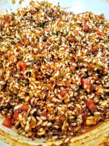 - Pirincin suyunu süzelim tuz karabiber pul biber kimyon kuru reyhan kuru naneyi ve kabuğu soyulup ince küp küp doğranmış domatesi ilave edip karıştıralım.