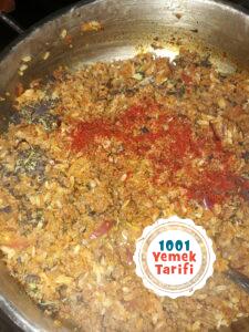 - Daha sonra içerisine pirinç, bulgur ve baharatları ekleyerek harmanlıyoruz.