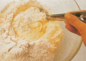 - Karışımı daha büyük bir kaseye alın ve hindistan cevizini ilave edin. Metal bir kaşıkla elenmiş unu da ilave edin ve aynı yönde iyice karıştırın.