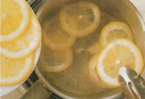 - Küçük bir kapta şekeri ve suyu iyice karıştırın. Düşük ateşte karıştırarak, kaynayana kadar şurubu pişirin ve dilimlenmiş limonları ekleyin. Şurubu ateşten alarak soğumaya bırakın.
