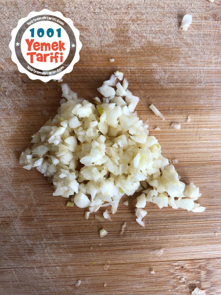- – 3 Diş sarımsağı soyalım isterseniz rendeleyebilirsiniz yada benim gibi küçük küçük doğrayıp bıçakla üstünden bastırıp suyunu çıkartılalım.