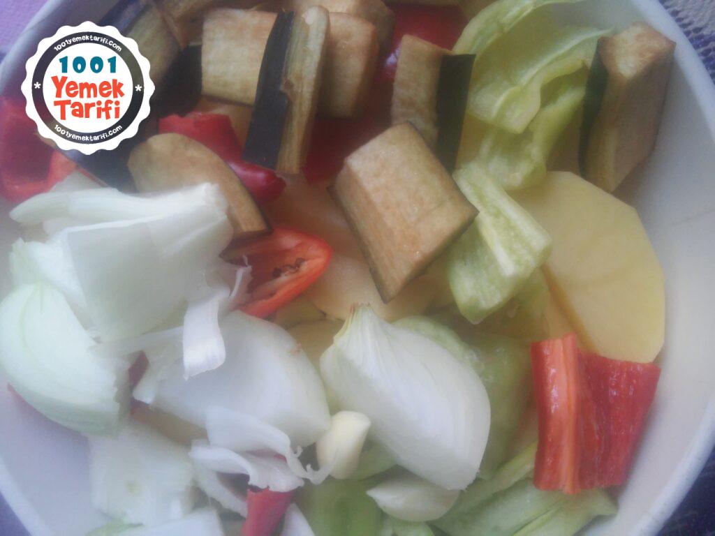 • O arada domates hariç tüm sebzelerimizi yıkayıp,soymuş olduğumuz patates ve alacali soydugumuz patlicanlari dilediğimiz boyutlarda doğruyoruz.