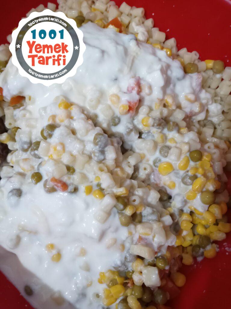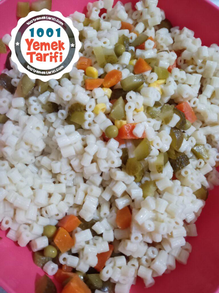 • Geniş bir kabın içine soğumuş olan makarnayı, garnitürü, mısırları, küp küp doğradığımız kornişon turşusunu ekliyoruz.